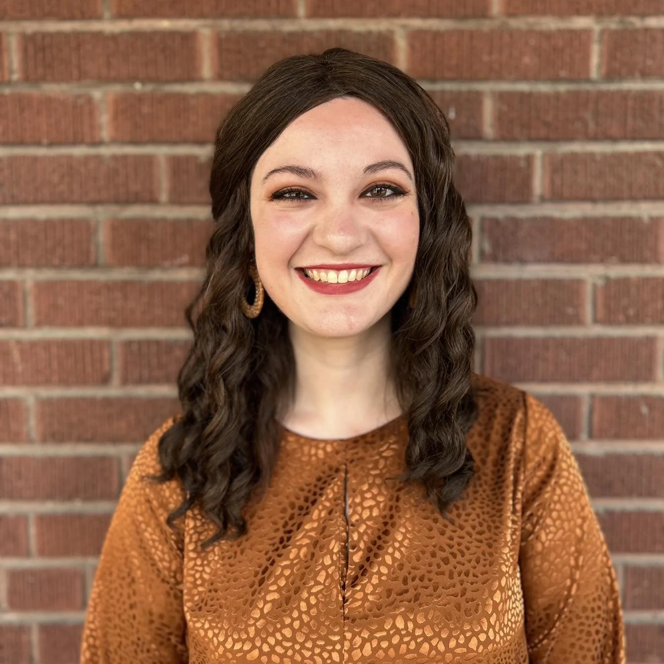 • A smiling woman with long, wavy brown hair and bangs, wearing a light gray long-sleeved top, standing against a tan brick wall.